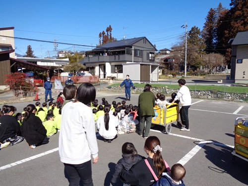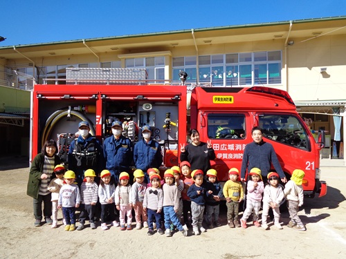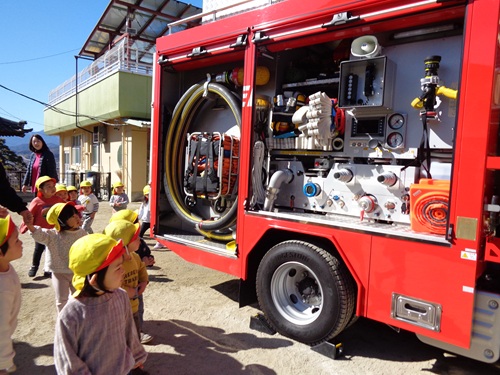 避難の様子を見ていただき、保育園職員に消火器の使い方を教えていただきました。そして最後に消防車の前で一緒に写真を撮っていただきました。
