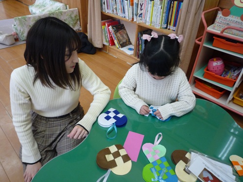 最初は、「んー難しい」「先生これどうやるの?」と言う声が多くありましたが、コツをつかむと、「楽しい」「もっとやりたい」と、楽しんで編み物をする子どもたちの姿が見られます。