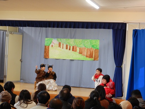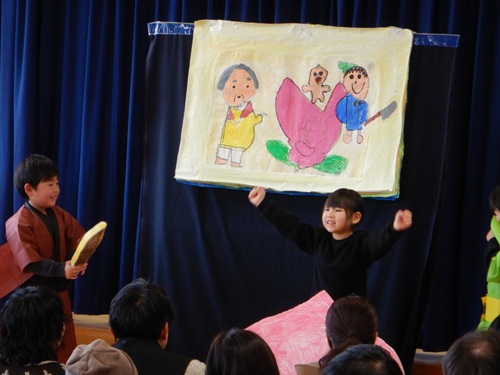 祖父母参観で発表した紙芝居『ももたろう』をしました。お礼の言葉を伝え、手作りのハンカチをプレゼントしました。