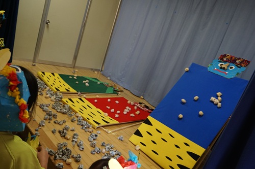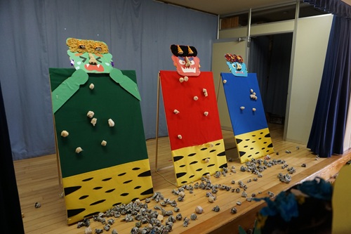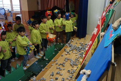手作りの鬼のお面をかぶり、赤、青、緑の鬼に向かって新聞で作った豆を投げます。