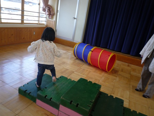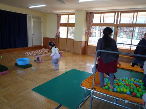 保育園の遊戯室で、親子で体操をしたり、親子競技をしたり…トランポリンや平均台、マット遊びやすべり台などを予定しています。